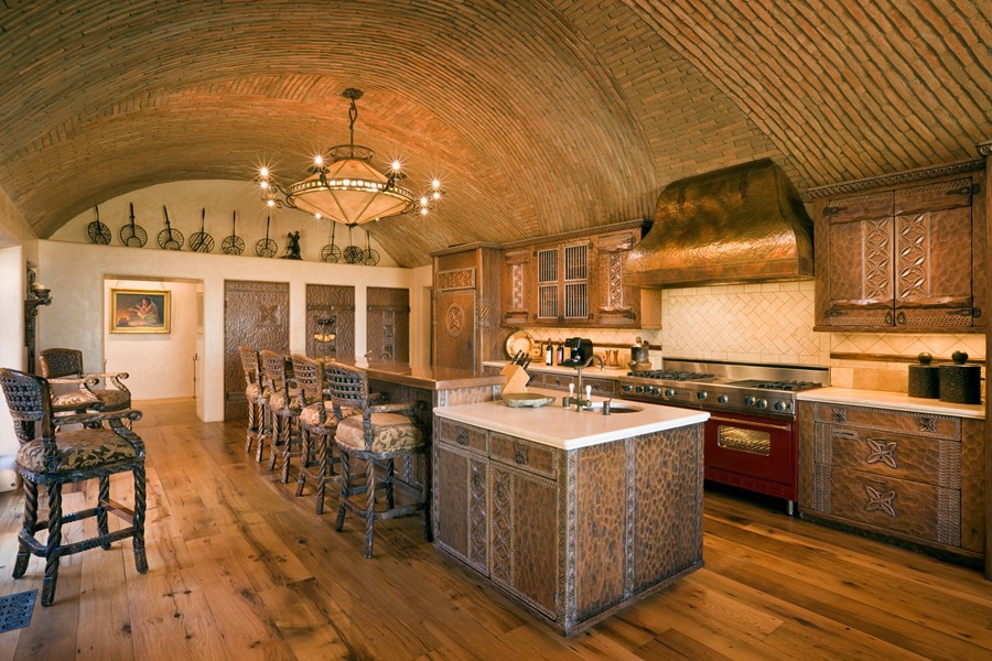Modern elements, such as the lighting system and the light marble tile backsplash, offer a refreshed take on a classic style. Poorly lit, vaulted ceilings can easily create an oppressive shadow above you, instilling an eerie and uninviting atmosphere. Having vaulted ceilings in the kitchen will allow us to add extra or bigger windows, thus letting in more light. Vaulted ceilings are a beautiful feature in a home, but with such a grand space you want to make sure it's properly lit. Truly a craftsman kitchen, pvc pipes are in the underside of the kitchen island which can serve as a wine rack.
